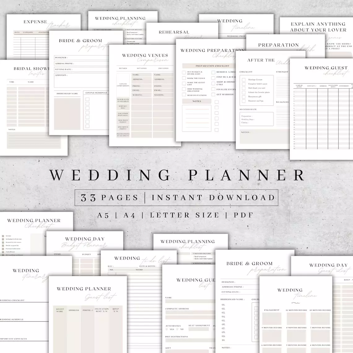 This bundle includes budget planners, seating charts, guest lists, vendor checklists, timelines, and more, making it perfect for brides, grooms, event planners, and coordinators.